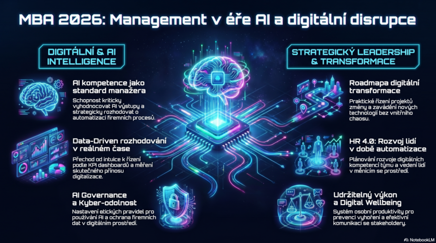 Proto jsme inovovali náš MBA program tak, aby odpovídal realitě roku 2026 a potřebám moderních firem. Nové zaměření propojuje management, digitalizaci, AI, firemní procesy, komunikaci i strategické řízení změn.